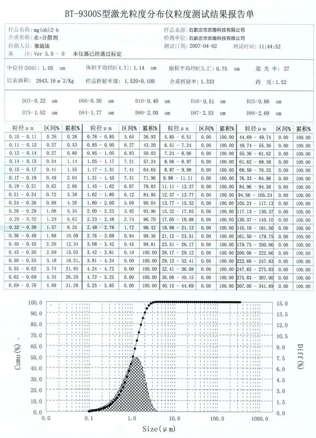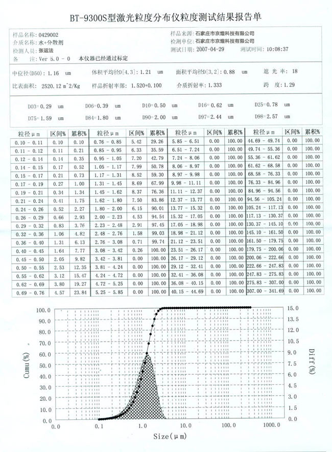bt-9300s型激光粒度分布仪粒度测试结果报告单![]() ![]() |